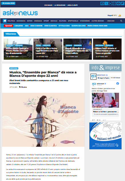 ANSA annuncia l'uscita di "Clessidra" e l'imminente pubblicazione dell'album "Ensemble per Bianca d'Aponte". Clicca sul link o sull'immagine sotto per aprire l'articolo: https://www.ansa.it/sito/notizie/cultura/2025/09/20/esce-lalbum-bianca-daponte-ensemble-per-bianca_27f98e61-b50f-4e42-a8ba-c61c7292ead7.html