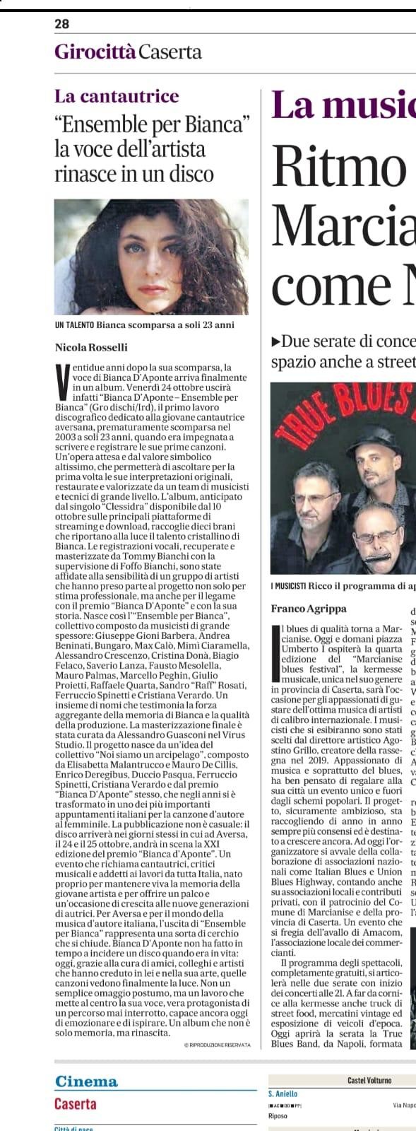 Paolo Talanca di "Avvenire" dedica un lungo articolo al Premio Bianca d'Aponte e all'imminente uscita di "Ensemble per Bianca d'Aponte" . Clicca qui o sull'immagine sotto per scaricare l'articolo: