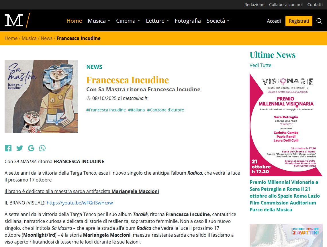 Ottiche Parallele Magazine annuncia l'uscita del singolo di Francesca Incudine "Sa mastra". Clicca sul link o sull'immagine sotto per leggere l'articolo completo : https://otticheparallelemagazine.com/2025/10/06/francesca-incudine-sa-mastra-brano-dedicato-alla-maestra-antifascista-mariangela-maccioni/