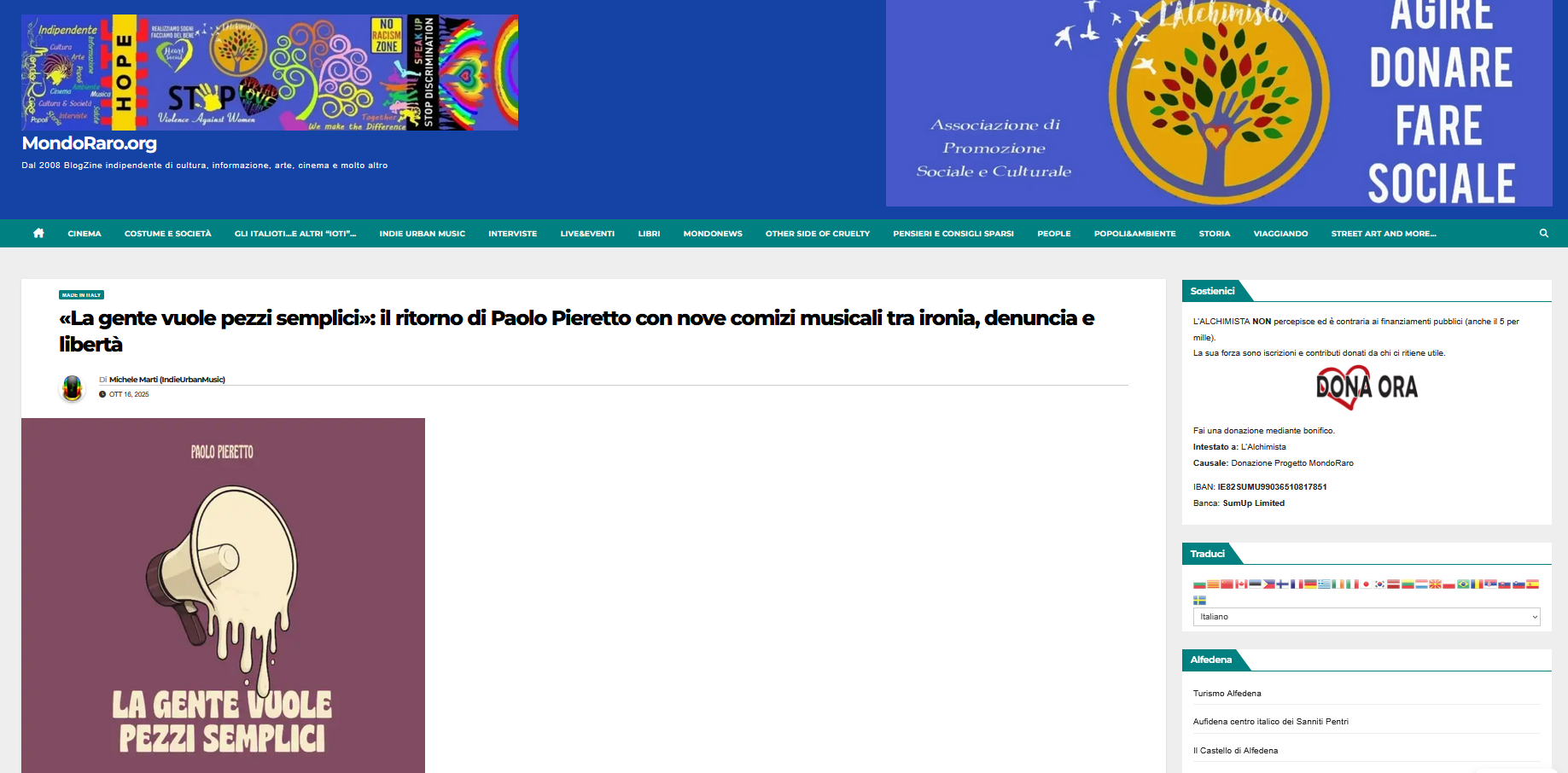 Politicamente corretto dedica un lungo articolo all'uscita di "La gente vuole pezzi semplici", il nuovo album di Paolo Pieretto. Clicca sul link o sull'immagine sotto per leggere l'articolo completo: https://www.politicamentecorretto.com/2025/09/25/esce-domani-la-gente-vuole-pezzi-semplici-nove-comizi-musicali-di-paolo-pieretto/