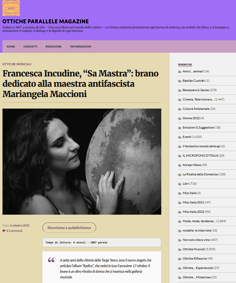 Terza Pagina Magazine annuncia l'uscita del singolo di Francesca Incudine "Sa mastra". Clicca sul link o sull'immagine sotto per leggere l'articolo completo: https://www.terzapaginamagazine.com/ritorna-francesca-incudine-esce-sa-mastra-dedicato-alla-maestra-sarda-antifascista-mariangela-maccioni/musica/