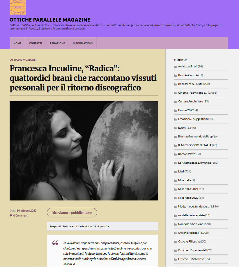 Ottiche Parallele Magazine annuncia l'uscita del singolo di Francesca Incudine "Sa mastra". Clicca sul link o sull'immagine sotto per leggere l'articolo completo : https://otticheparallelemagazine.com/2025/10/06/francesca-incudine-sa-mastra-brano-dedicato-alla-maestra-antifascista-mariangela-maccioni/