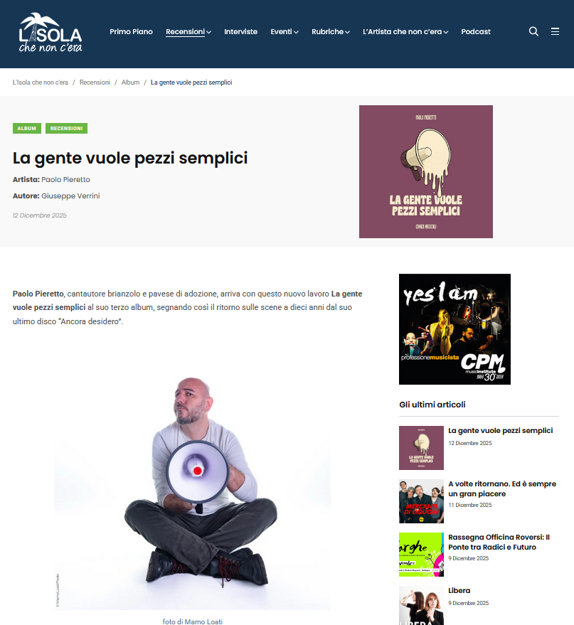 Michele Marti dedica un articolo su MondoRaro.org a Paolo Pieretto e al suo "La gente vuole pezzi semplici". Clicca sul link o sull'immagine sotto per leggere l'articolo completo: https://www.mondoraro.org/archives/187409/la-gente-vuole-pezzi-semplici-il-ritorno-di-paolo-pieretto-con-nove-comizi-musicali-tra-ironia-denuncia-e-liberta/10/2025/16/